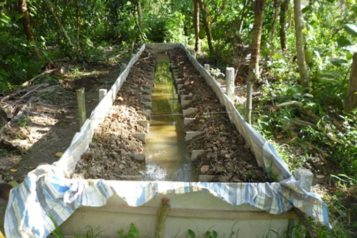 Bể hình chữ nhật (ngang: 4 m x dài: 10 – 20 m), chiều cao thành bể từ 0,8 – 1,0 m, lót bạt trong bể. Dùng đất sét xếp bên trong vòng quanh thành bể, độ dày đất 0,4 – 0,5 m. Diện tích đất chiếm 50% diện tích bể (giữa bể không cho đất). Cấp nước vào bể, khống chế độ sâu của nước khoảng 30 – 40 cm (đất cao hơn mặt nước trong bể khoảng 10 – 15 cm). Bể có ống nước cấp vào và ống nước thoát ra (bố trí ống nước cấp vào và ống nước thoát ra đối diện nhau. Mặt bể có thể thả ít lục bình.